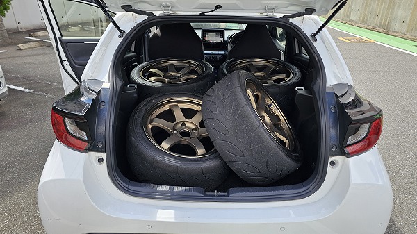 ヤリスに255-40-R17のタイヤ4本(ホイルは9J+22)楽勝で積める。
