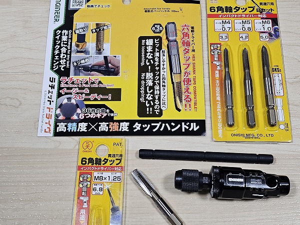 このタップハンドルは六角軸で外れないので便利。ラチェット機構もあるし。